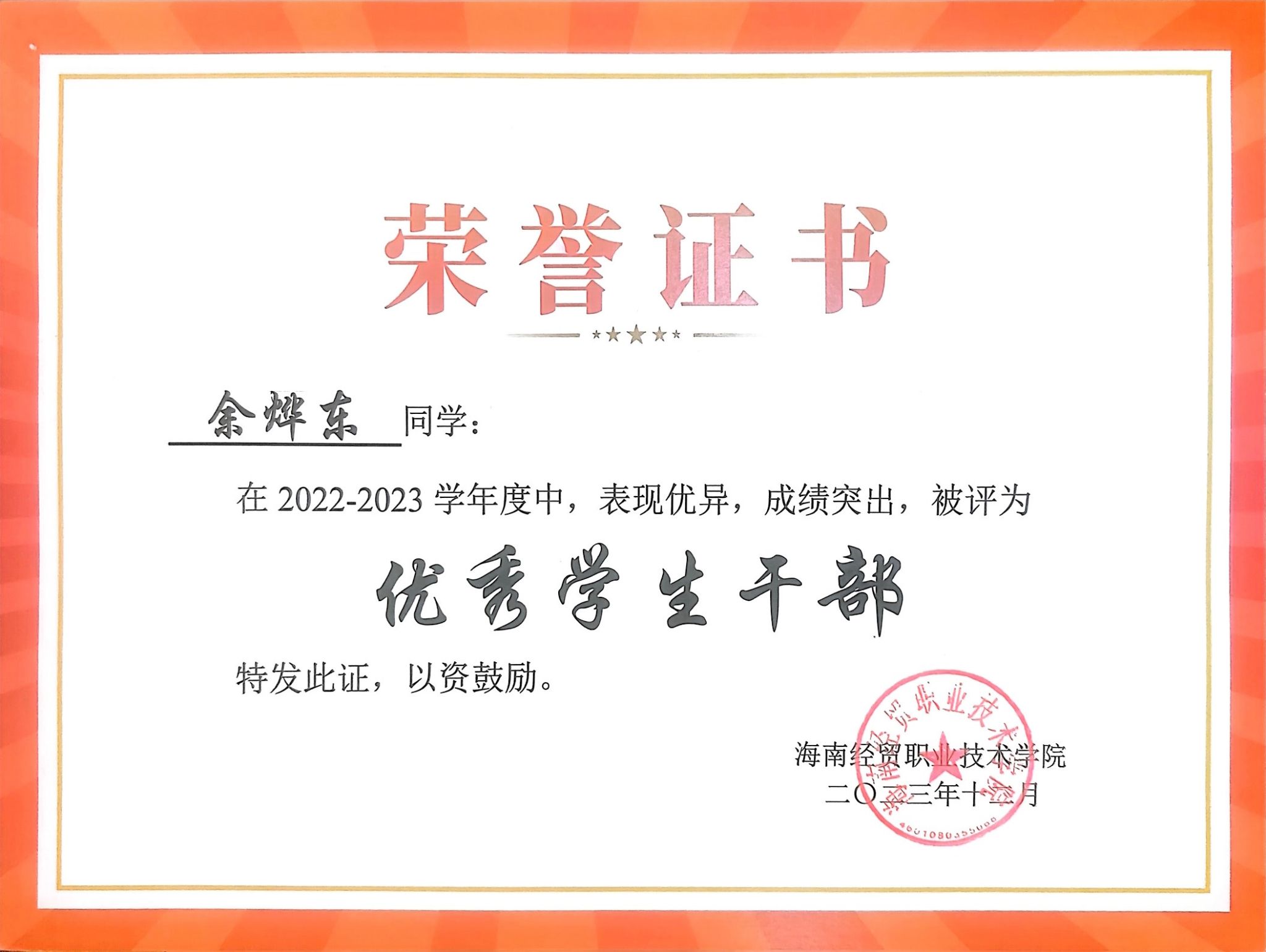 余烨东荣获多项荣誉
