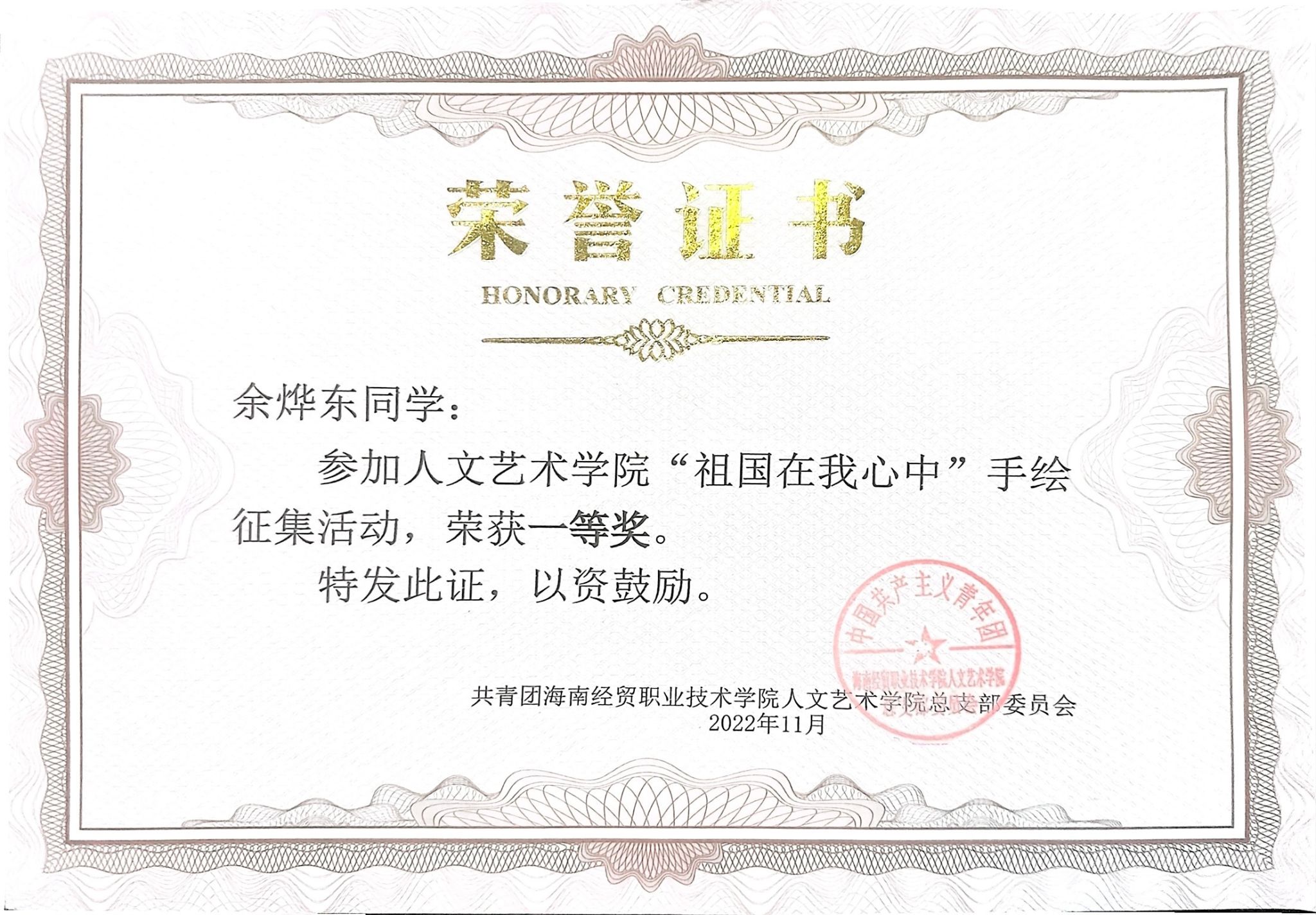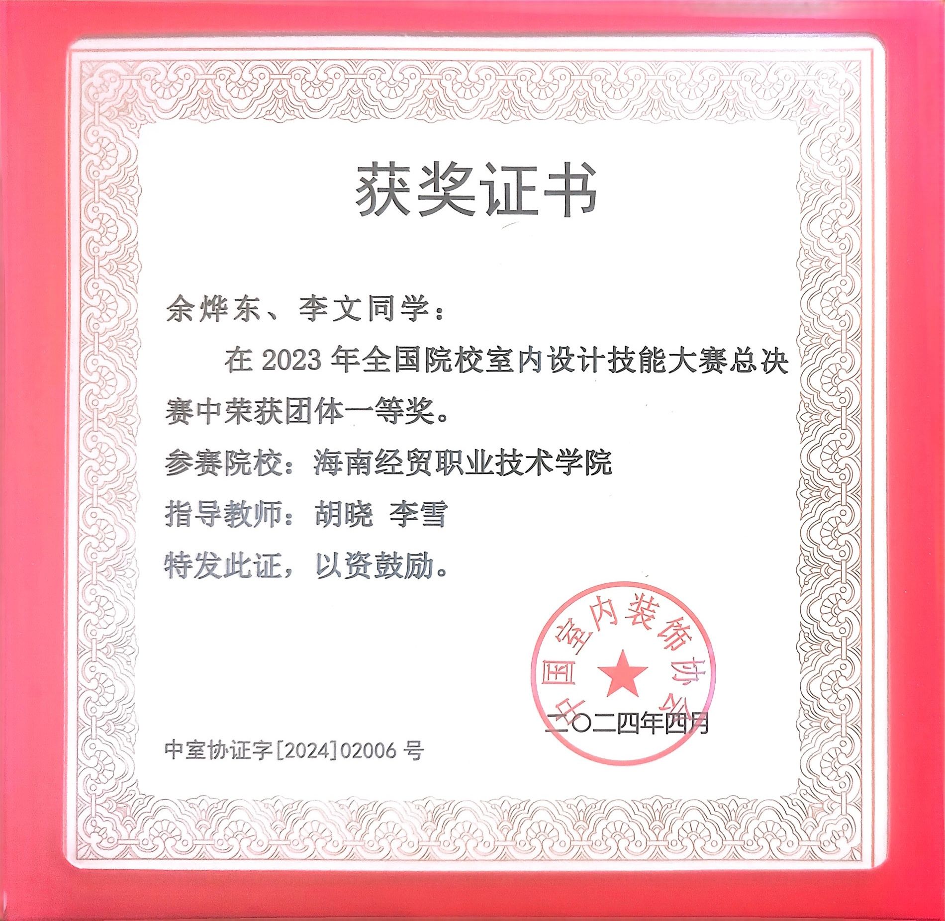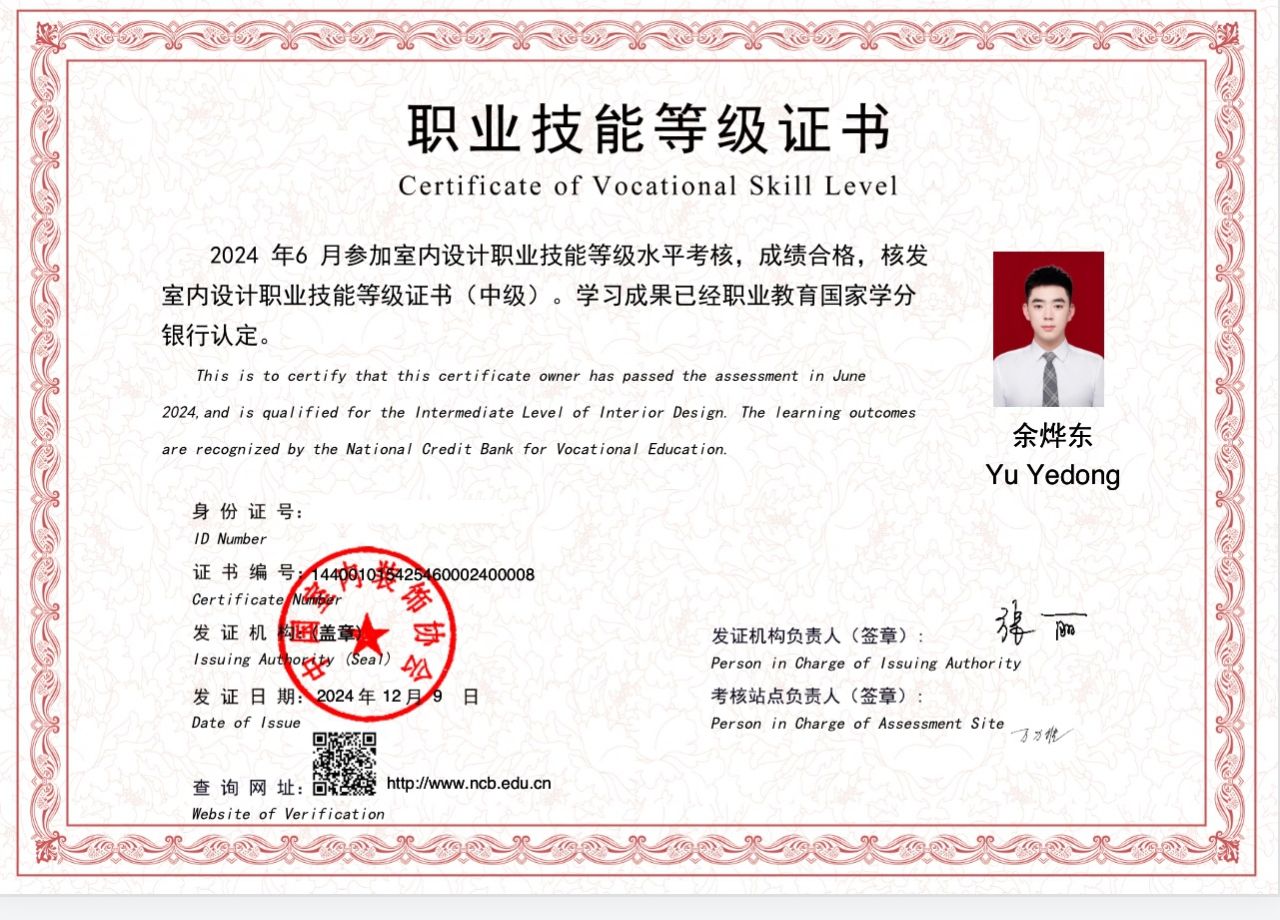 余烨东,中共预备党员,bv伟德源自英国始于1946人文艺术学院2022级环境艺术设计专业室内设计二班班长。曾获得2023-2024年度国家奖学金、2023-2024年度学校一等奖学金、2022-2023学年优秀学生干部称号;获得2023年全国院校室内设计技能大赛团体一等奖、海南省职业院校技能大赛高职组“环境艺术设计”赛项三等奖、第三届校园文化创意大赛优秀奖等国家级、省级、校级比赛20余项荣誉。