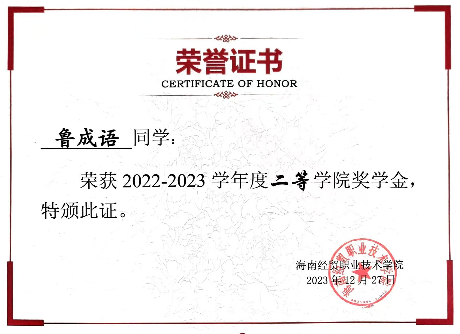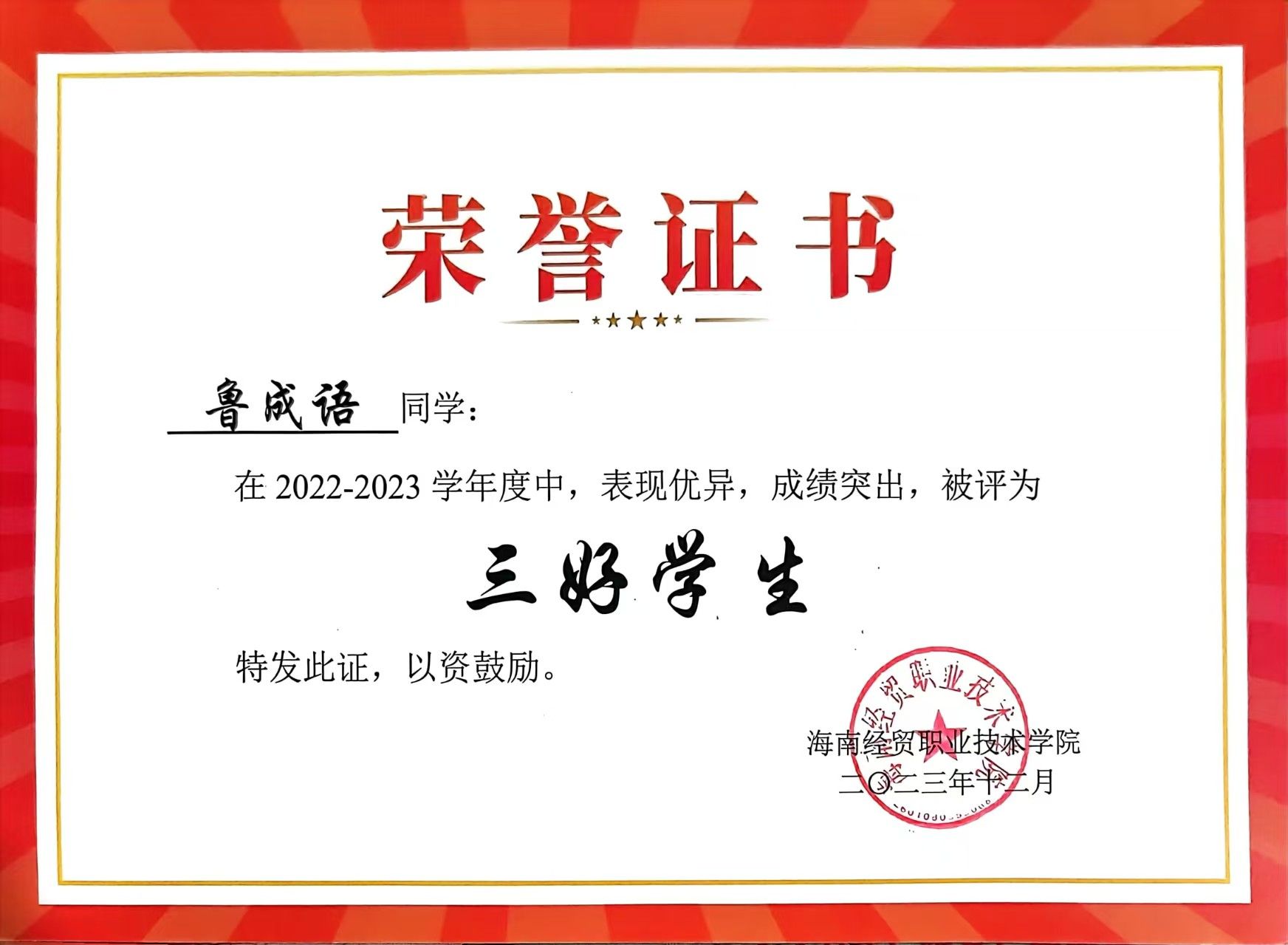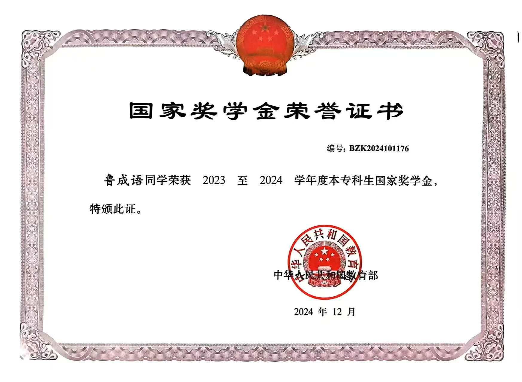 正是这种对专业专注钻研的精神和对学习的执着热爱,让鲁成语在众多专业竞赛中脱颖而出,屡获佳绩。他凭借扎实的专业知识和出色的实践能力,顺利考取了全国计算机等级证书(一级)、大数据应用开发证书(初级)等多项技能证书,为自己的专业技能增添了有力的证明。鲁成语始终坚信,理论知识与实践应用并非孤立存在,而是相辅相成、紧密相连的。只有将二者有机结合,才能真正掌握知识的精髓,实现学以致用,这才是学习的真谛所在。