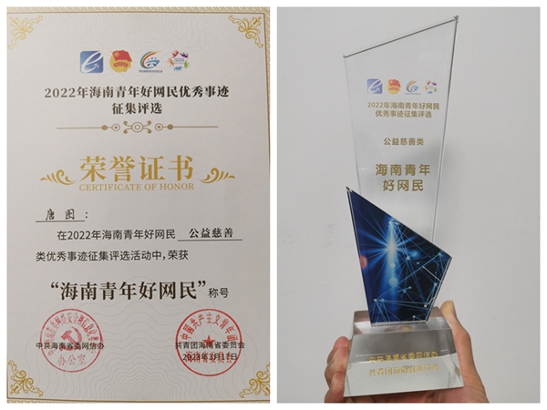 获得海南省总工会、海南省职工服务中心“我为工会献一计”活动三等奖,四次荣获学校优秀共青团干部称号,获得海南省大学生国家安全知识竞赛三等奖优秀指导老师……一个个荣誉激发出新动能,唐图将用对志愿服务的热忱和对学生工作的热爱,继续书写自己的人生故事。