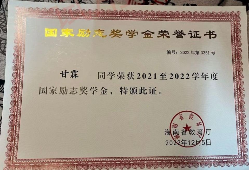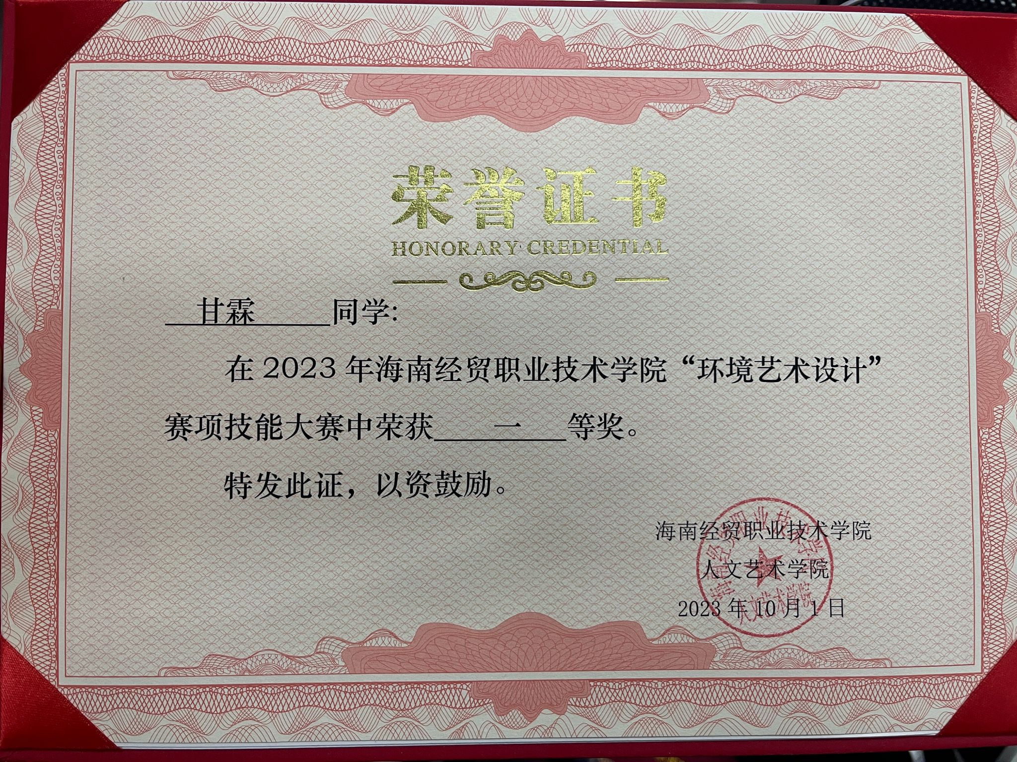 甘霖,bv伟德源自英国始于1946人文艺术学院2021级环境艺术设计专业(室内设计方向)学生。曾获2022-2023年国家奖学金、2021-2022年国家励志奖学金、第九届中国国际“互联网+”大学生创新创业校赛金奖、2021-2022学年度学院三等奖学金、2023年海南自贸港创业大赛校级赛二等奖,考取室内设计技能等级证书(中级)、全国计算机等级证书”(一级)、国家普通话等级证书(二级乙等)等多项技能证书。