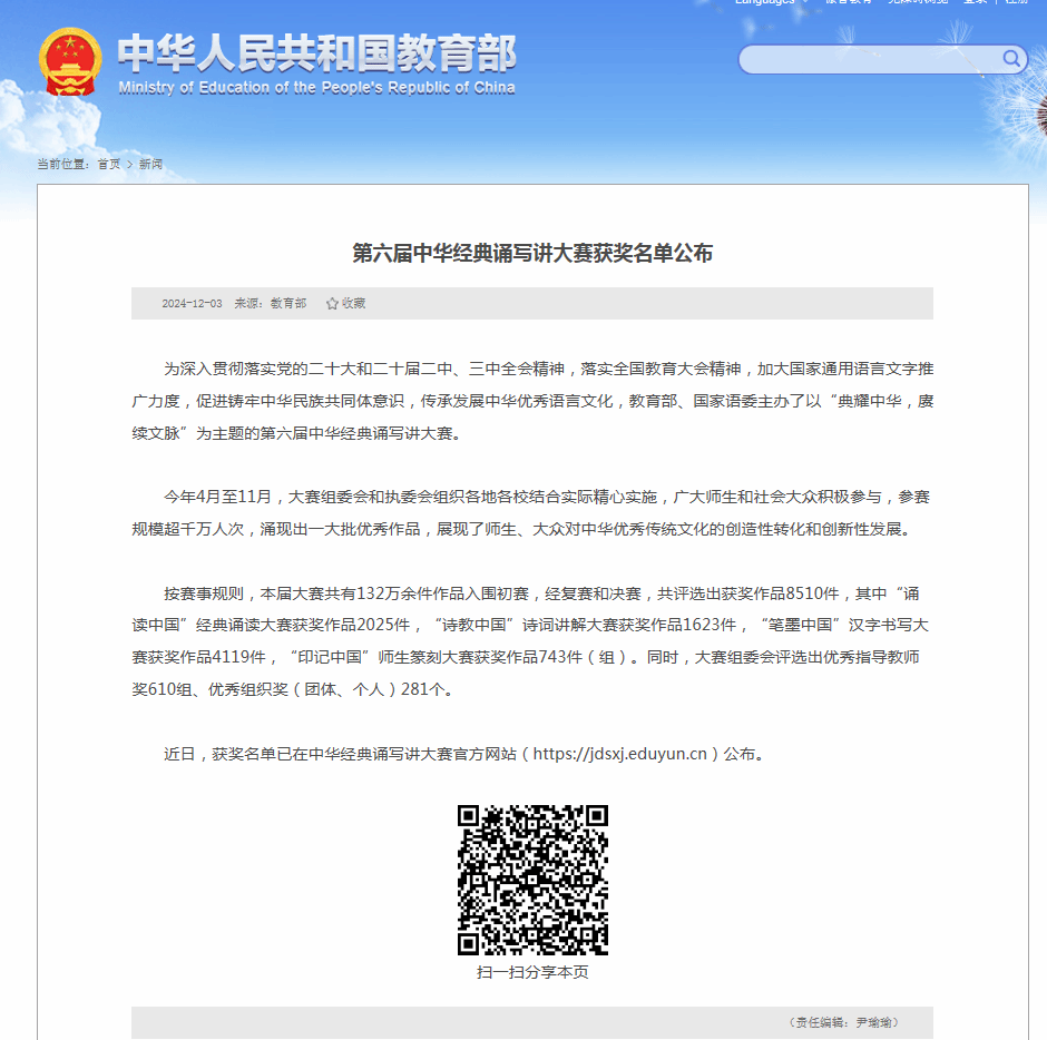 近日,教育部公布了第六届中华经典诵写讲大赛获奖名单,我校学生盖相辰、王聪、欧威、李易庭、王静璇的作品“生活在英雄们的中间”,荣获第六届中华经典诵写讲大赛“诵读中国”经典诵读大赛全国职业学校学生组全国二等奖。